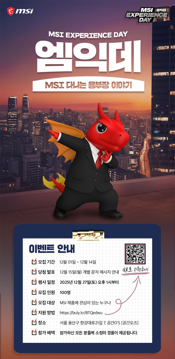MSI는 오는 12월 27일(토), 서울 용산구에 위치한 공간 O’S[공간오즈]에서 ‘MSI 익스피리언스 데이(MSI Experience Day)’를 개최하고, 오프라인 체험 행사에 참여할 참가자 100명을 모집한다고 밝혔다.