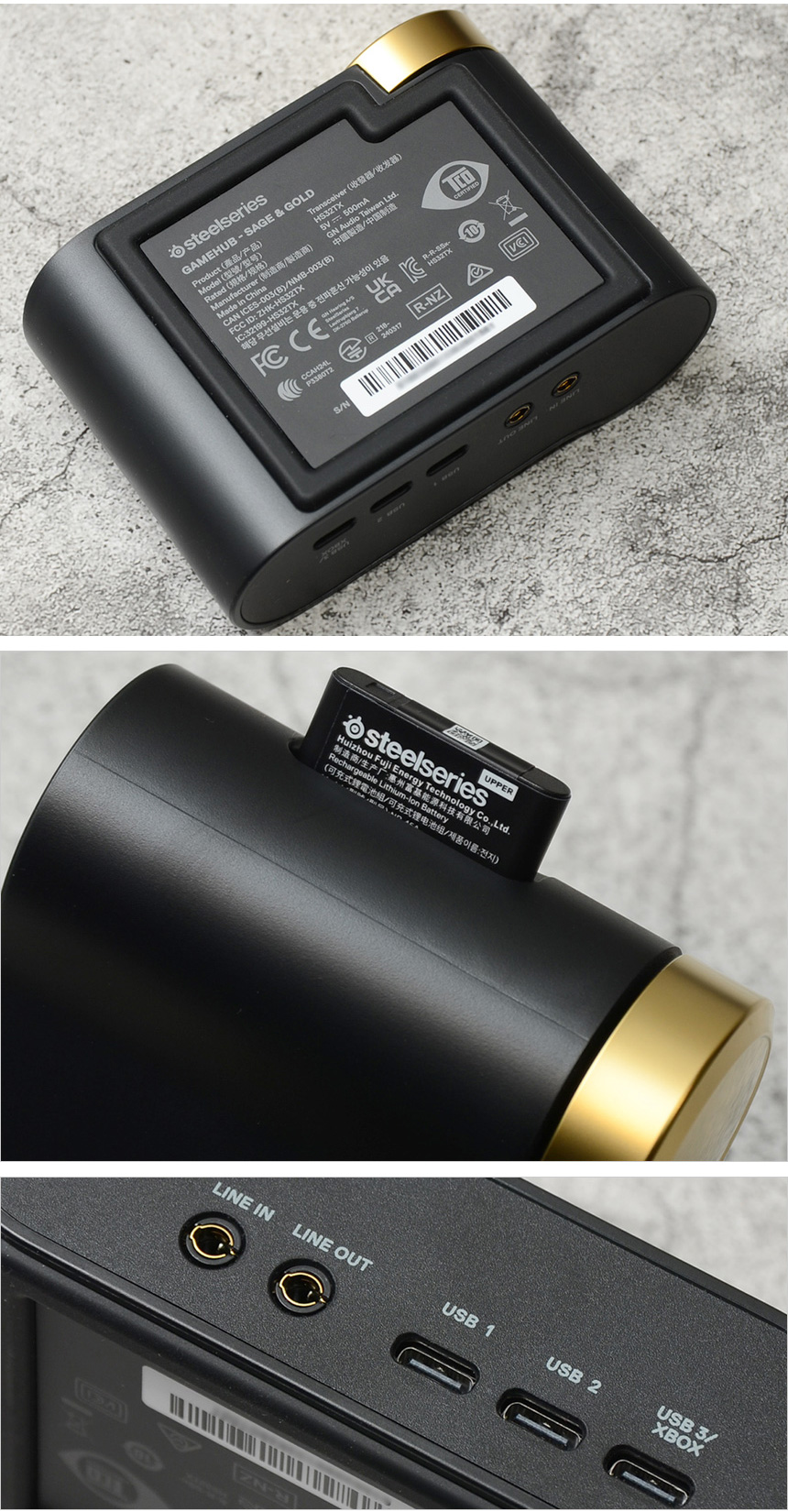 바닥면에는 고무패드가 부착되어 미끄러짐을 방지하며 측면에는 헤드셋에서 사용하는 배터리를 충전할 수 있도록 설계된 것을 확인할 수 있다. 또한 후면에는 3개의 C타입 입력 단자와 Line 단자가 설치되어 다양한 디바이스를 연결해 사용할 수 있다.