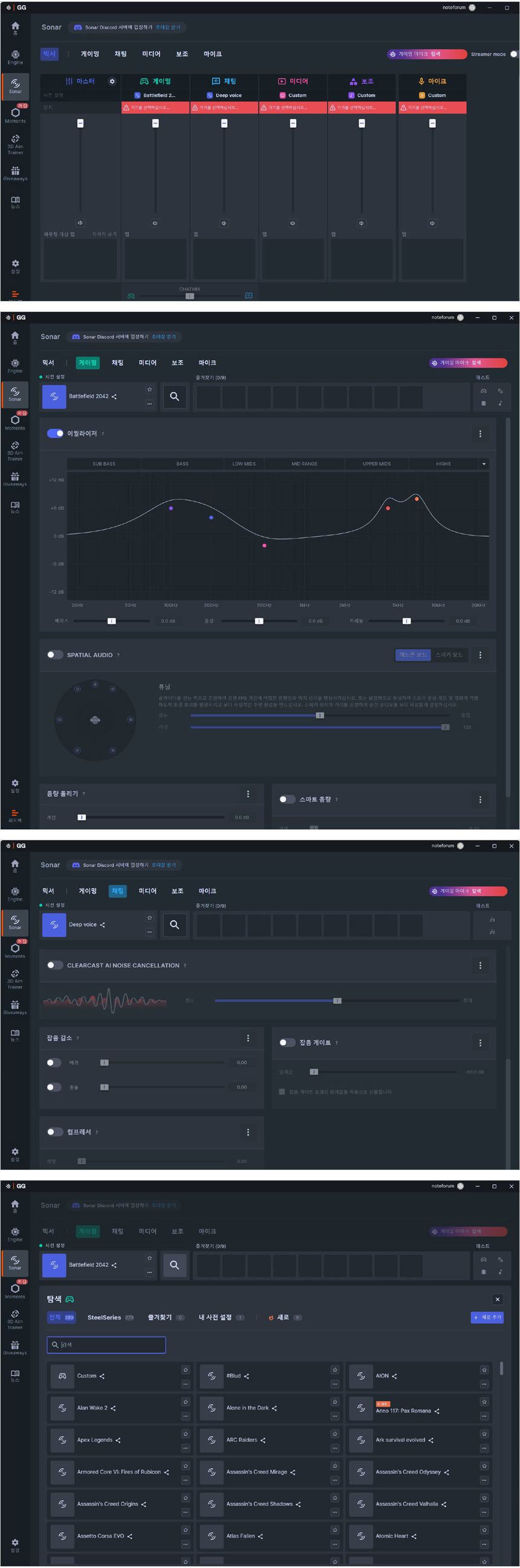 Sonar 메뉴로 이동하면 더 디테일한 사운드 설정이 가능하다. (회원가입후 로그인을 해야 사용할 수 있다.) 믹서를 통해 오디오 관련 기기를 손쉽게 설정할 수 있으며 유명 게임에 최적화된 EQ 프로파일이 제공해 최상의 사운드를 즐길 수 있다. 일반 메뉴에서는 입체음향 설정을 지원하는데 반해 채팅 메뉴에서는 소음제거 관련 설정을 지원한다.