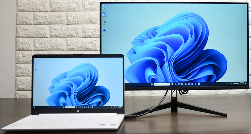 노트북과 HDMI로 연결한 모습으로 원활하게 작동하는 것을 확인할 수 있었다. 집이나 노트북사무실에서 대화면으로 노트북을 사용하고 싶을 경우 좋은 대안이 될 것이다. 또한 많은 유저들이 사용하는 게이밍 UMPC와 연결해 대화면으로 게임을 즐길 수 있다. 상단의 사진은 게이밍 UMPC 연결 테스트를 진행하고 있는 모습으로 원활하게 동작하는 것을 확인할 수 있었다. (C타입 to HDMI 케이블을 사용했다.)