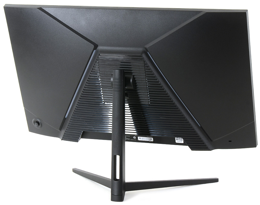 모니터의 디자인은 가격대비 상당히 고급스러운 것을 확인할 수 있다. 블랙 컬러 베이스로 중후한 느낌을 주며 저가형 모델과 달리 마감 완성도도 뛰어나다. 군더더기 없는 전면부 처리로 시선이 분산되지 않는 반면 후면부는 게이밍 모니터 답게 상당히 화려하게 구성되어 있다.