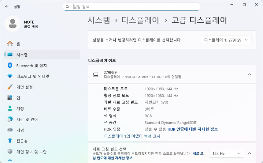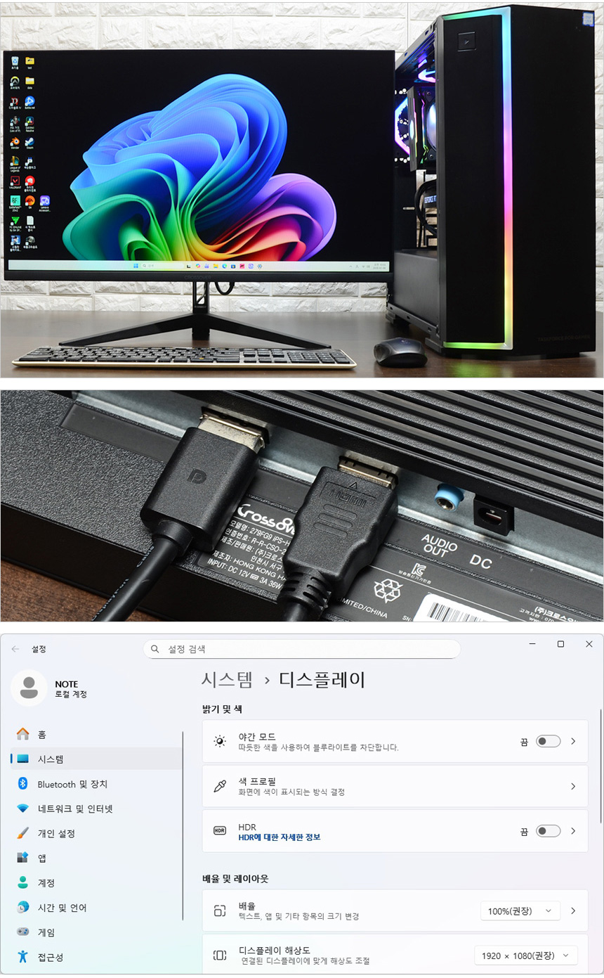 테스트를 위해 PC와 모니터를 책상위에 셋팅한 모습으로 슬림 베젤을 적용한 27형 모델답게 많은 공간은 차지하지 않았다. 집이나 사무실 등의 협소한 책상에도 쉽게 설치해 사용할 수 있을 것이다. 디스플레이 설정 메뉴에서 HDR 설정이 가능한 것을 확인할 수 있으며 HDMI 도 지원해 사용자의 취향대로 연결해 사용할 수 있다.