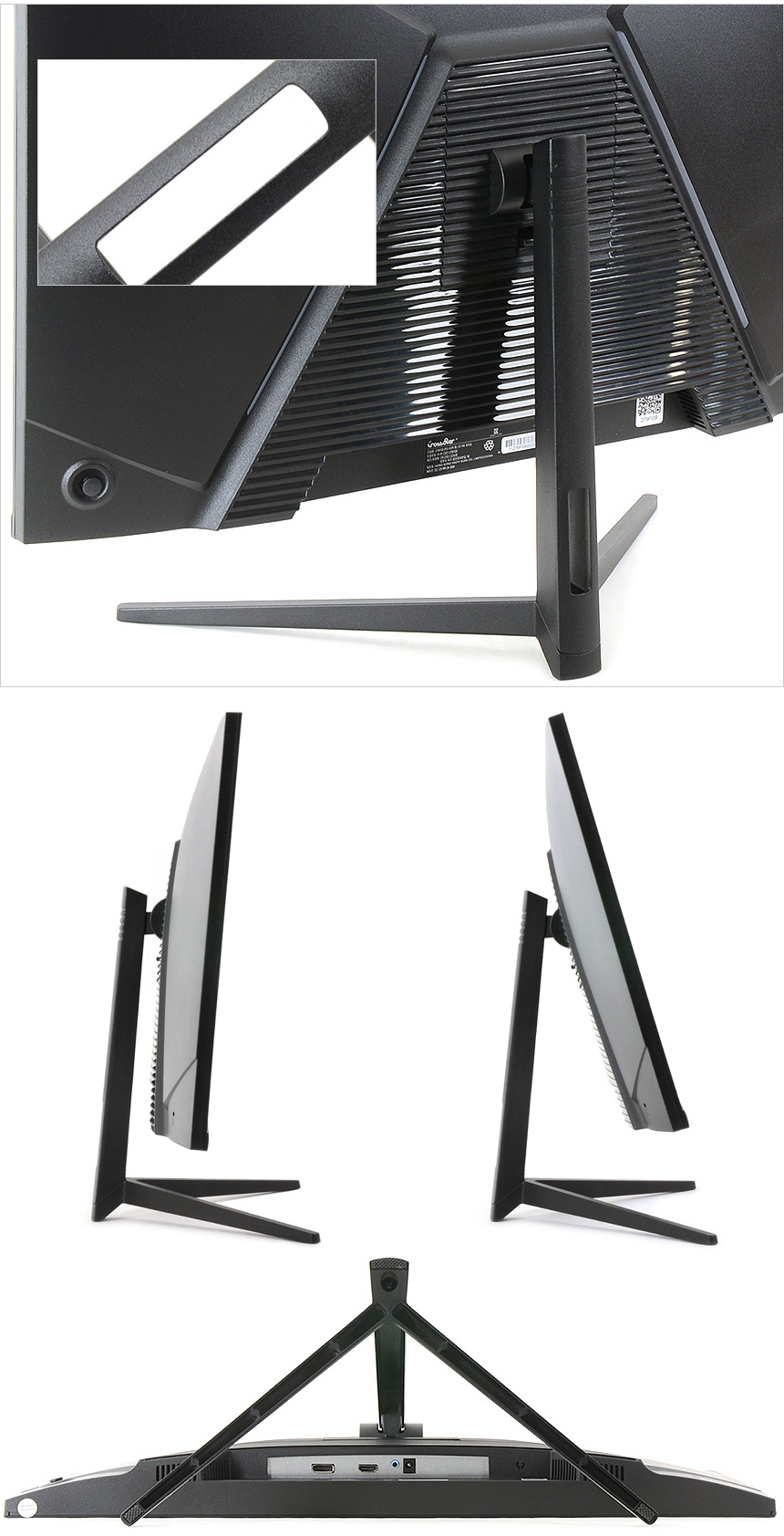 전면 하단부의 모습으로 중앙에 크로스오버 로고가 세겨져 있으며 하단에는 통풍구가 설치된 것을 확인할 수 있다. (참고로 스피커는 지원하지 않는다.) 크로스오버 279FG9 iPS-HDR 패스트144 게이밍은 유저들의 눈건강을 생각한 모델로 안티글레어 타입을 적용해 반사로 인한 스트레스를 최소화 했으며 블루라이트 감소와 플리커 프리 기술을 지원해 시력저하나 장시간 PC사용으로 인한 눈의 피로감을 최소화 한다.