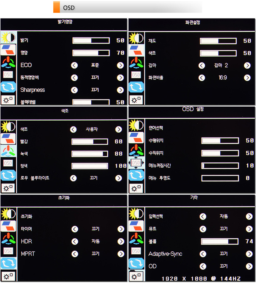 OSD 메뉴를 확인하고 있는 모습으로 밝기와 명암비, 화면모드 (ECO) 설정을 지원하며 블랙레벨과 색온도 설정이 가능한 것을 확인할 수 있다. 또한 MPRT를 비롯해 HDR, 어댑티브 싱크, OD 설정도 지원한다. (핫키를 통해 입력소스와 4개의 조준선 선택이 가능하다.)