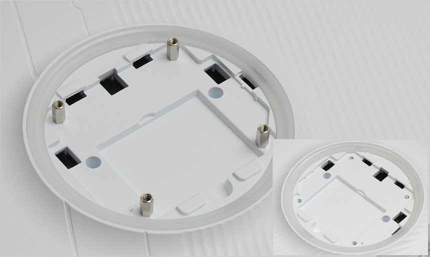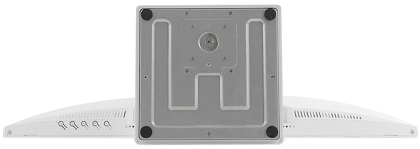 중앙에 75mm 베사홀이 설치되어 벽에 걸거나 ARM 등에 장착해 사용할 수 있으며 (툴리스 방식으로 스탠드를 손쉽게 분리할 수 있고 베사 연장볼트를 지원해 손쉽게 벽에 부착할 수 있다.) 하단에는 2개의 DP 단자와 HDMI 단자가 각각 제공되며 전원 & 오디오 Out 단자가 설치된 것을 확인할 수 있다.