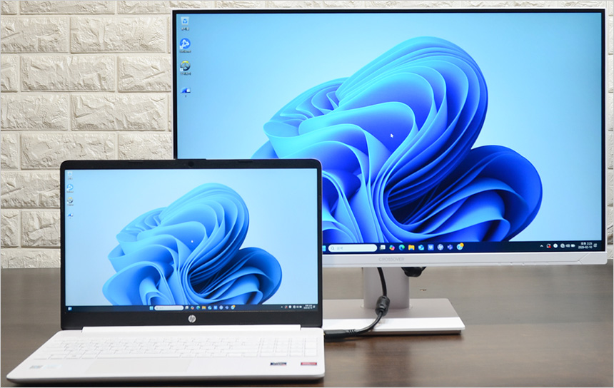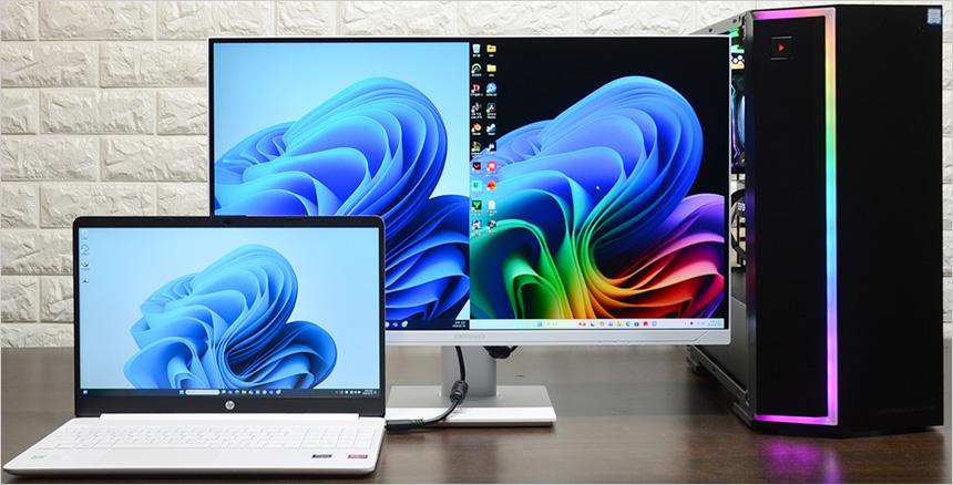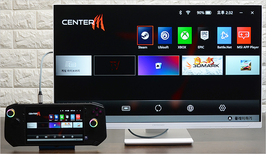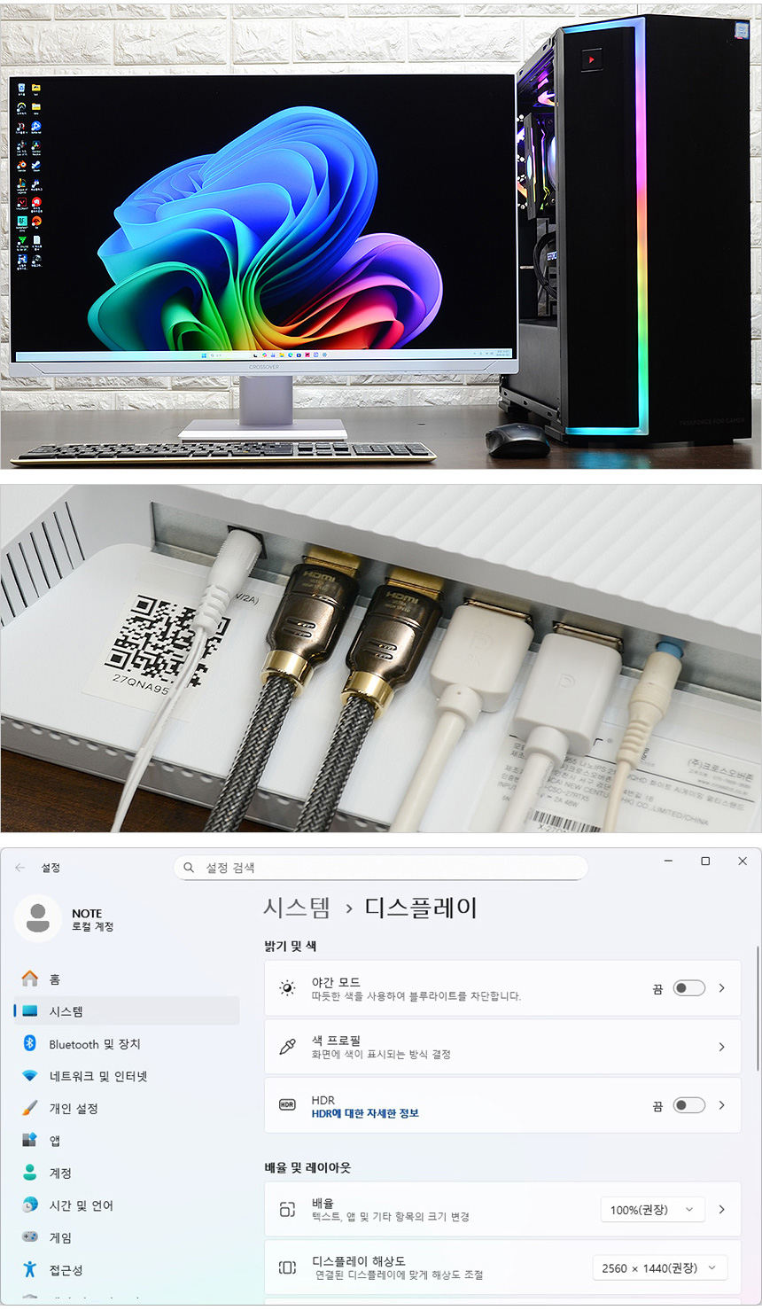 노트북과 HDMI로 연결한 모습으로 원활하게 작동하는 것을 확인할 수 있었다. 대화면으로 노트북을 사용하고 싶거나 고성능 노트북을 게임 용도로 활용할 경우 좋은 대안이 될 것이다. (작업용 노트북의 경우 성능은 뛰어난데 패널의 주사율은 60Hz 인 경우가 많다. 이때 크로스오버 27QNA955를 연결하면 바로 게이밍 노트북으로 변신하게 된다.) 또한 게임콘솔이나 게이밍 UMPC등과 연결해 대화면으로 게임을 즐길 수 있다.