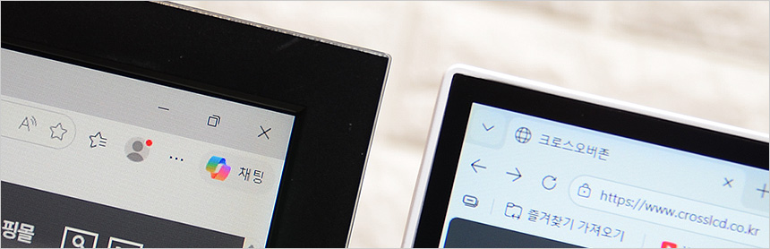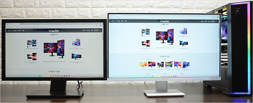 2대의 모니터를 설치한 김에 베젤 두께를 확인하고 있는 모습으로 확연한 차이를 보여주었다. 슬림 베젤이 적용된 모델로 높은 몰입감을 경험할 수 있을 것이다.
