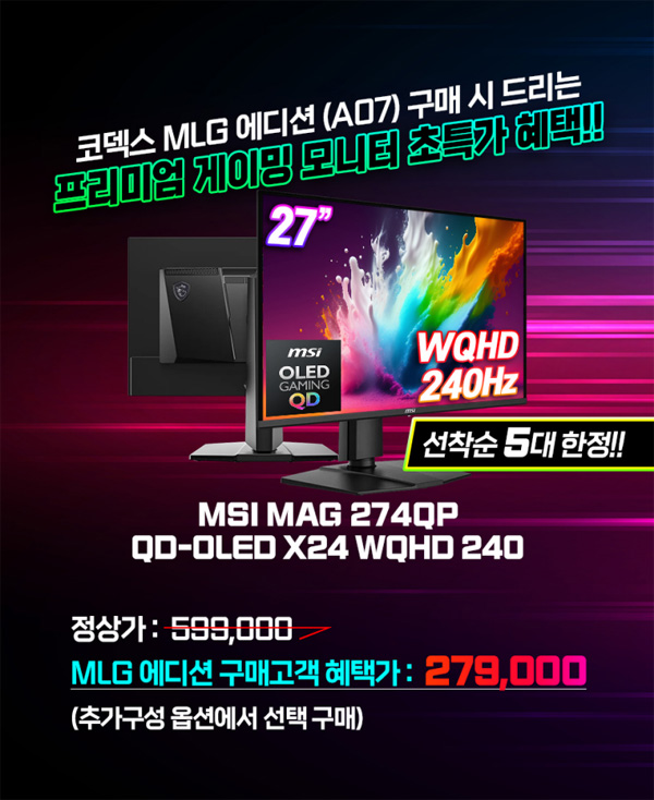 이번 프로모션은 해당 에디션 구매 고객을 대상으로 진행되며, 선착순 5명에게 MSI 최신 QD-OLED 게이밍 모니터를 할인된 가격에 구매할 수 있는 특별 혜택을 제공한다. 구매 방법은 MLG EDITION 데스크탑 구매 시 추가 구성 옵션에서 해당 제품을 선택하면 즉시 할인된 가격으로 함께 구매할 수 있다.