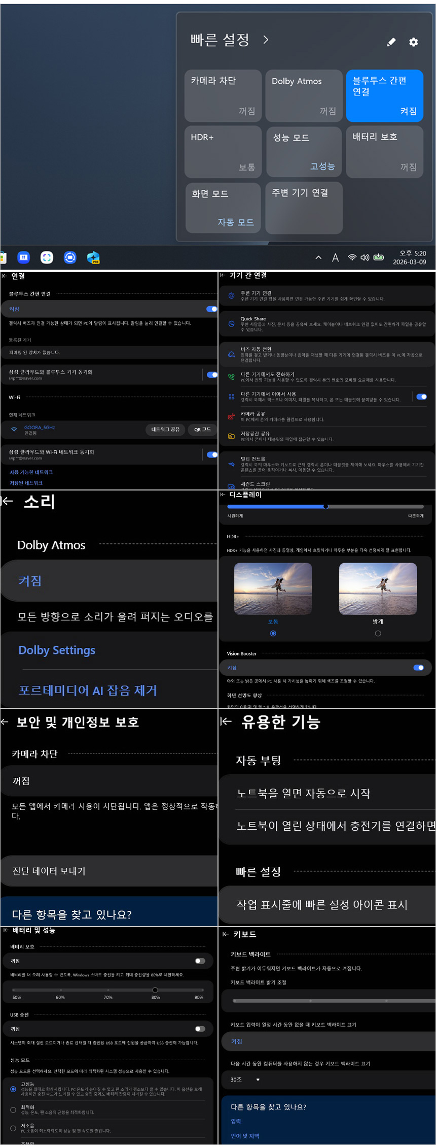 삼성 Settings의 모습으로 연결과 사운드 & 디스플레이 설정이 가능하며 퍼포먼스 설정과 자동부팅, USB 충전, 키보드 백라이트 설정 등을 지원한다. 또한 보안관련 설정에서 카메라 비활성화가 가능해 사생활 침해등을 미연에 방지할 수 있다.