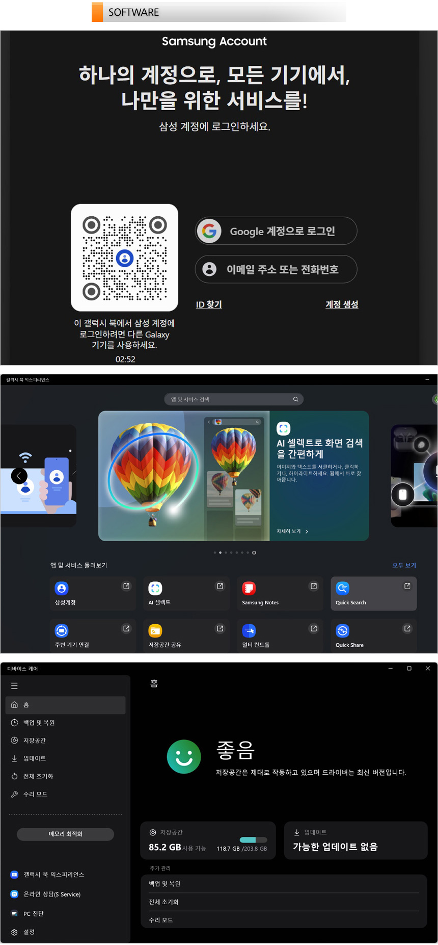 기존 갤럭시북 시리즈에서 지원하던 S/W 는 대부분 지원한다. 삼성 어카운트에서 QR코드 로그인을 제공해 삼성계정이 필요한 앱을 편하게 실행할 수 있으며 갤럭시북 익스피리언스를 실행하면 설치된 앱을 손쉽게 실행할 수 있다. 또한 디바이스 케어를 실행하면 업데이터가 가능해 최상의 컨디션으로 노트북을 사용할 수 있다. (노트북 출시 초기이기 때문에 드라이버나 바이오스가 빈번하게 업데이트 될 것이다. 자주 디바이스 케어를 실행하기 바란다.)