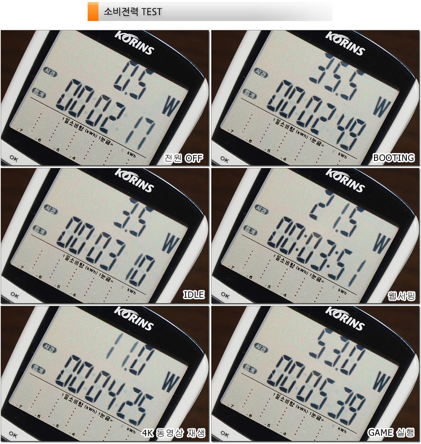 소비전력 테스트를 진행하고 있는 모습으로 (밝기 50%, 최고성능 모드) 캐주얼한 작업에서는 25W 미만의 낮은 소비전력으로 작동했으며 높은 성능을 필요로 하는 게임에서는 50W 이상으로 소비전력이 올라가는 것을 확인할 수 있었다. (고성능으로 셋팅하면 최대성능을 구현하기 위해 소비전력을 높인다. 이점 참조 바란다.)