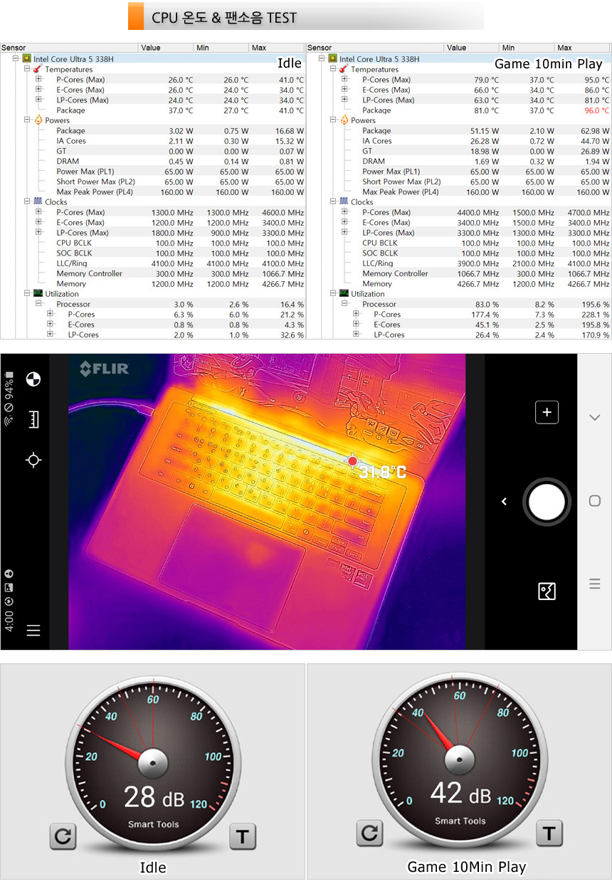 열화상 카메라를 이용해 게임 실행중 열분포를 확인했는데 상단중앙을 중심으로 열이 퍼져나가며 팜래스트 온도도 낮아 편하게 손을 올려두고 타이핑 할 수 있다. 뿐만 아니라 팬소음 테스트도 실행했는데 (최고 성능 모드) 캐주얼한 작업시에는 생활소음에 묻혀 팬소음이 들리지 않았으며 게임이나 영상편집 S/W 등을 실행했을 때에는 42dB 까지 팬소음이 높아지는 것을 확인할 수 있었다. (참고로 팬소음은 사무실 생활소음을 포함한 결과값이다. 이점 참조 바란다.)