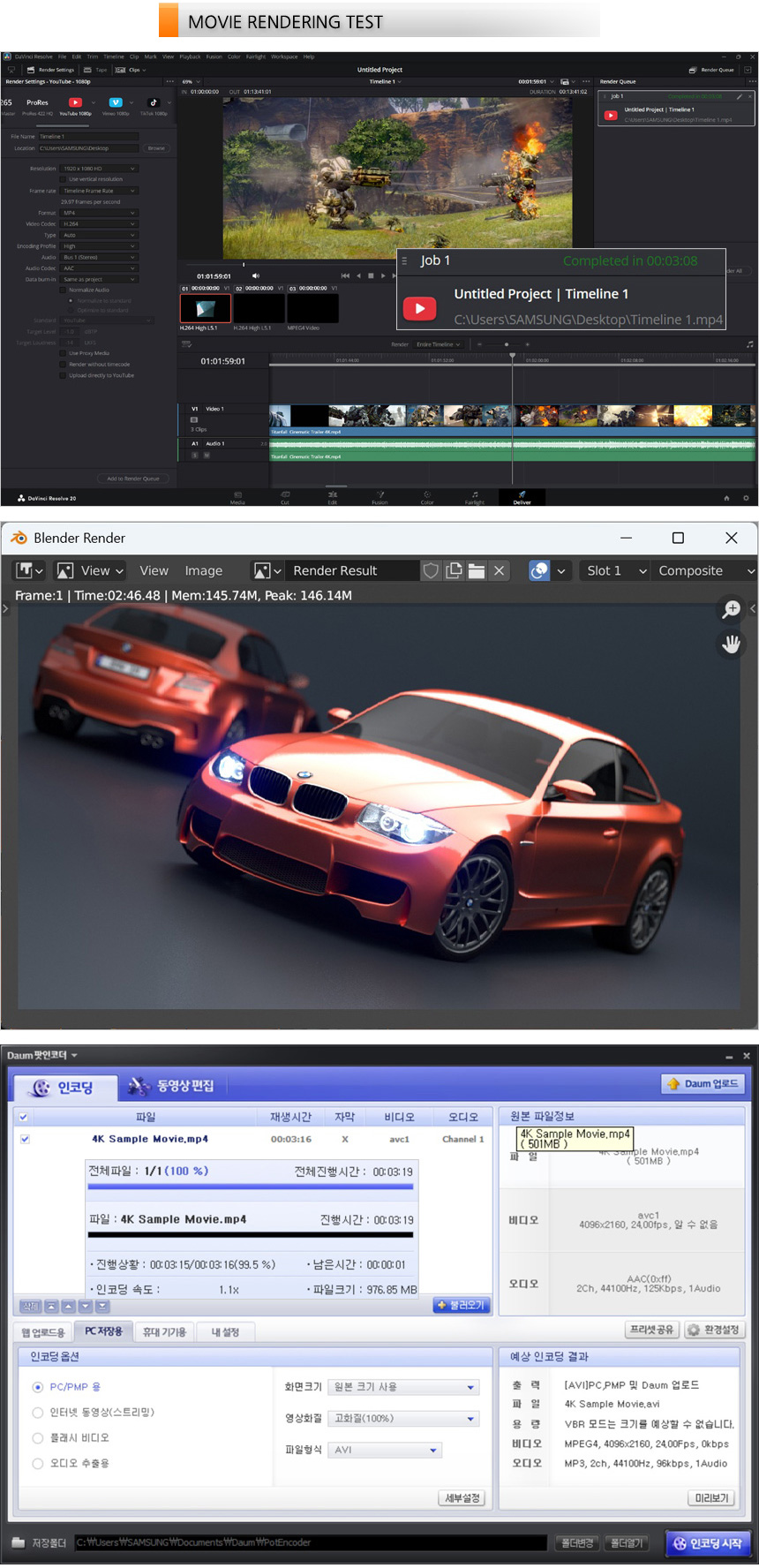 영상편집 S/W 다빈치 리졸브를 이용해 랜더링 테스트를 진행하고 있는 모습으로 (640MB, 920MB, 990MB 4K 동영상을 단일 동영상으로 랜더링, FHD 해상도에 H.264 비디오 코덱) 3분 08초가 소요되는 것을 확인할 수 있었으며 (225H를 탑재한 전작대비 1분 이상 시간이 단축되었다.) 블랜더 랜더링 테스트에서는 2분대의 빠른 랜더링 시간을 보여주었다. 또한 다음 팟인코더를 이용해 4K 동영상의 인코딩을 진행했는데 3분 19초의 인코딩 시간을 보여주었다.