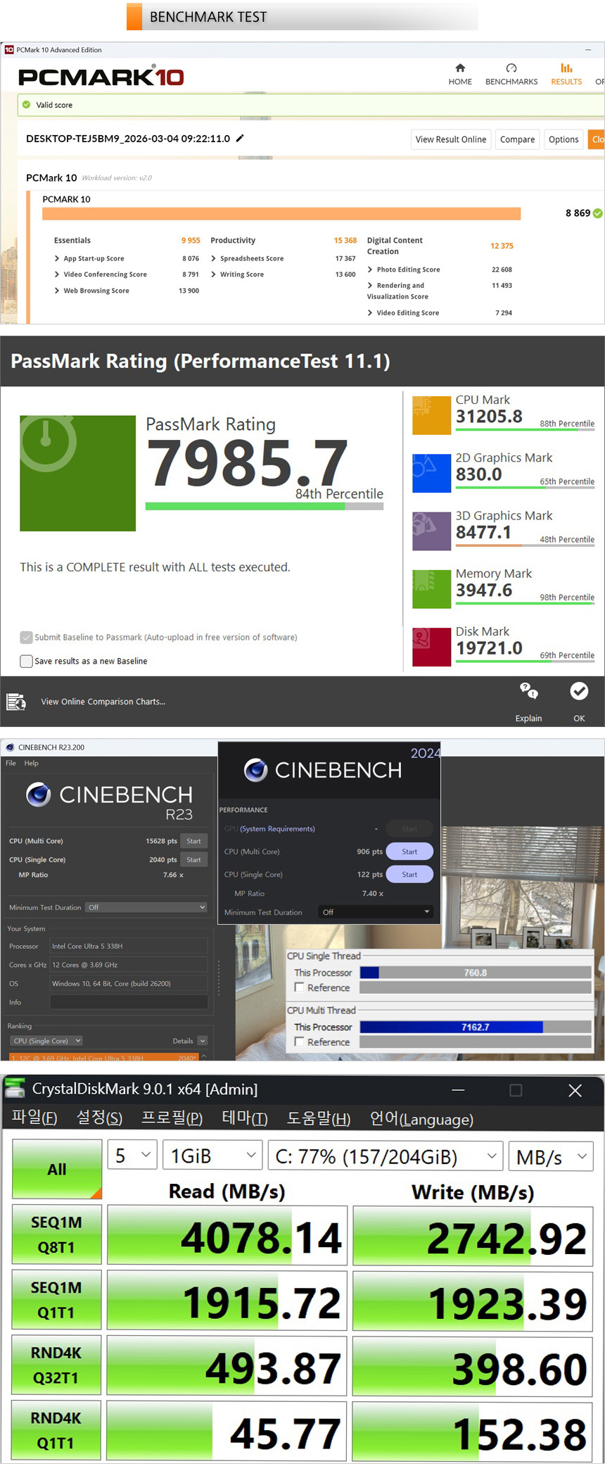 벤치마크 테스트를 진행하고 있는 모습으로 문서작업 뿐만 아니라 고성능을 필요로 하는 전문작업용 S/W도 부드럽게 실행할 수 있는 스코어를 보여주었다. 게이밍이나 크리에이터 노트북 수준은 아니지만 성능으로 인한 스트레스 없이 사용할 수 있을 것이다. (특히 그래픽관련 스코어 상승이 돋보인다.) 또한 저장장치의 속도를 확인해 보았는데 PCIe 4.0 NVMe SSD를 탑재해 속도가 상당히 빨랐다. (단, 용량이 256GB 이기 때문에 프로그램 설치가 많거나 대용량 데이터를 다룰 경우 추가 장착이나 업그레이드가 필요하다.)