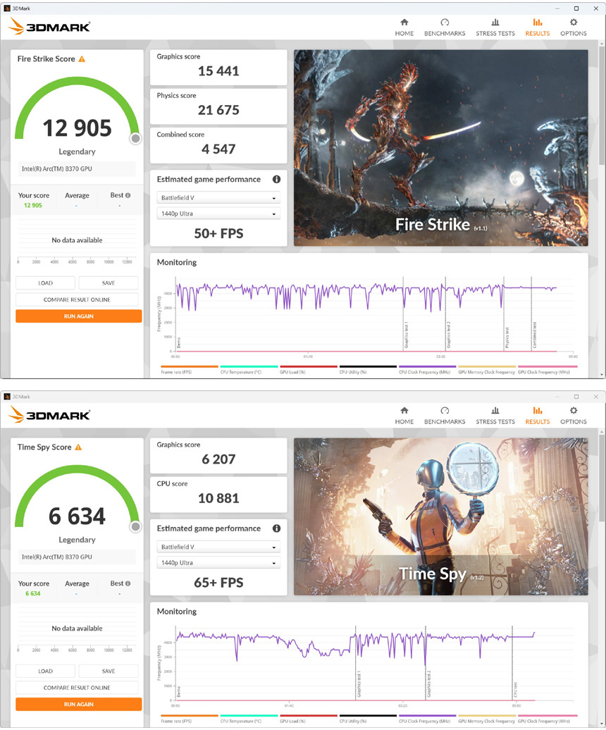 3DMARK를 이용해 3D 성능을 확인하고 있는 모습으로 인텔 아크 내장그래픽 130T 가 탑재된 전작과 확연히 비교되는 높은 스코어를 보여주었다. 구형 게이밍 노트북 수준의 3D 성능을 지원하는 모델로 Xess 업스케일링 기술만 활용하면 최신 게임도 원활하게 즐길 수 있다.