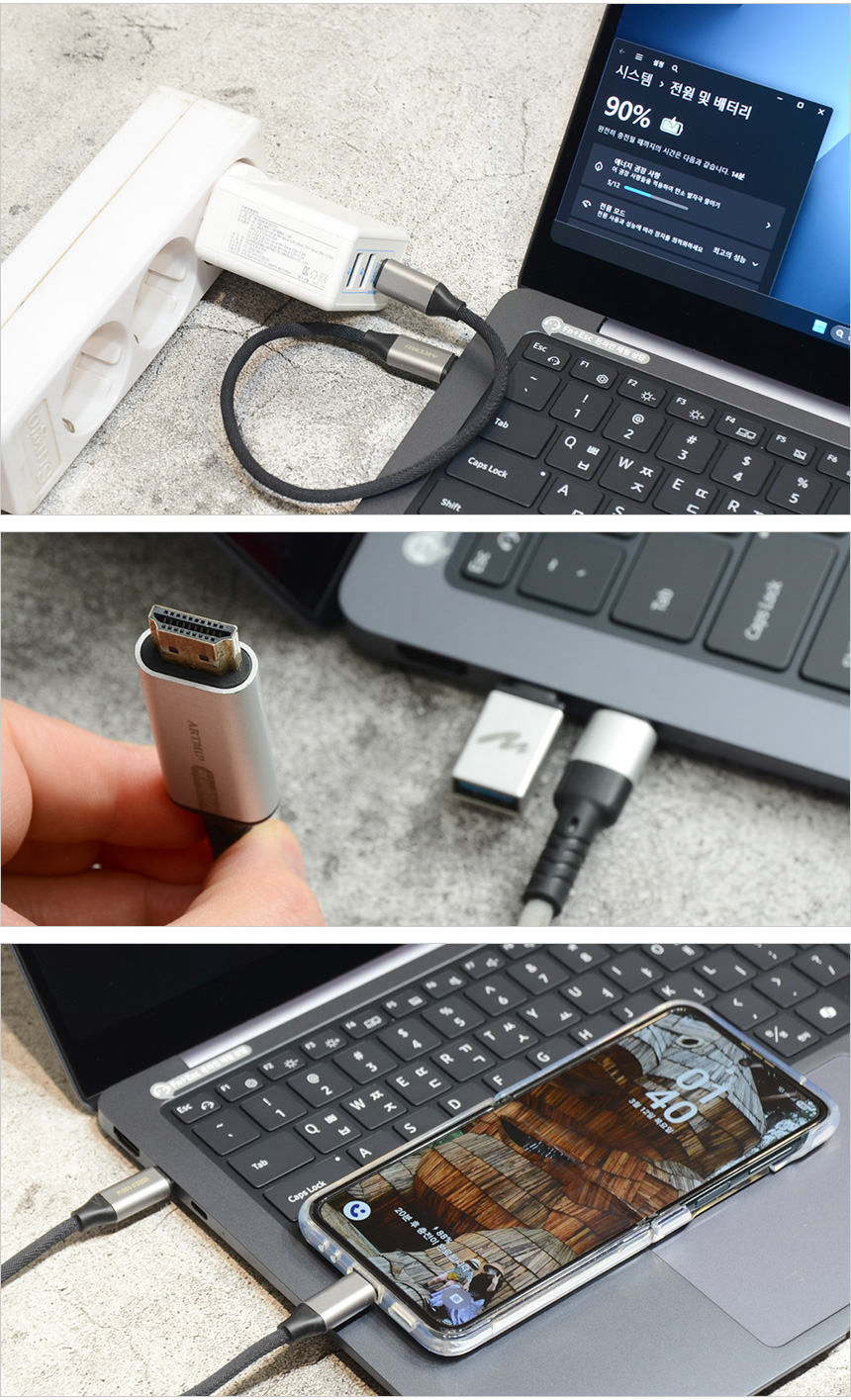 썬더볼트 4 단자는 빠른 데이터 전송이 가능하며 디스플레이 출력 지원으로 HDMI를 포함해 3개의 모니터를 연결할 수 있다. 또한 젠더를 사용하면 A타입의 일반 주변기기도 편하게 수 있으며 PD충전을 지원해 시중에서 쉽게 구입할 수 있는 PD 충전기를 이용해 전원을 공급할 수 있다. 뿐만 아니라 상시전원 지원으로 노트북이 꺼진 상태에서도 스마트폰 충전용으로 활용할 수 있다.
