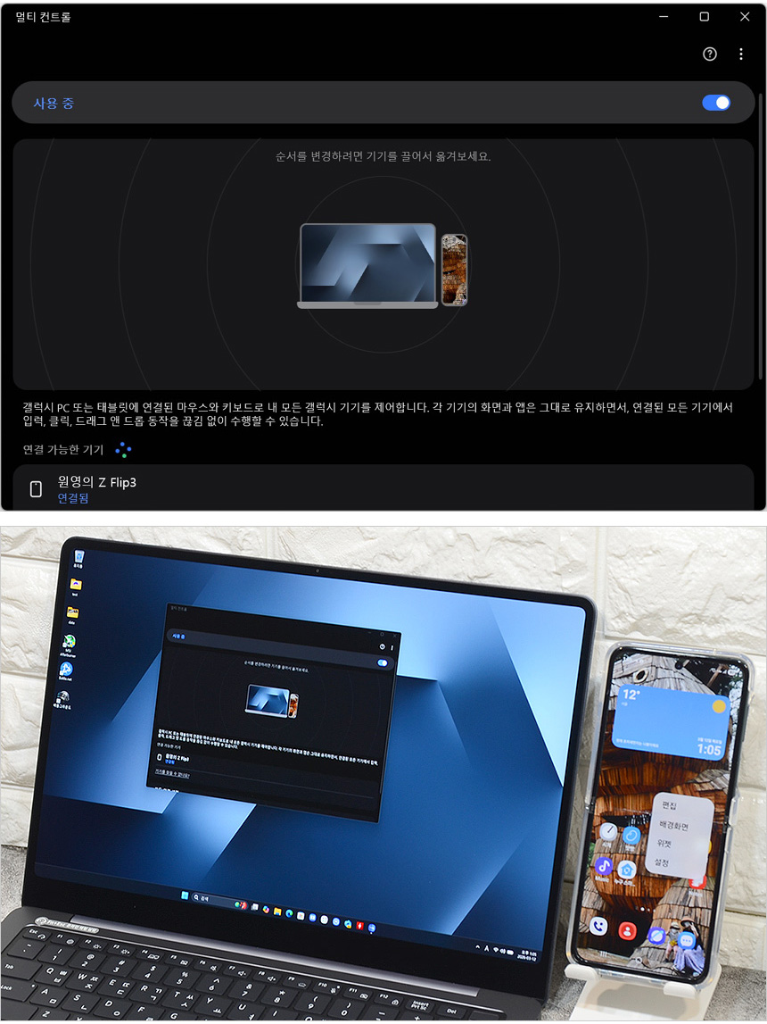 키보드와 마우스를 스마트폰에서도 사용할 수 있는 멀티 컨트롤 기능을 제공한다. 상단의 사진은 멀티 컨트롤을 테스트 하고 있는 모습으로 듀얼 모니터를 사용한 듯 자연스럽게 마우스 커서가 이동하는 것을 확인할 수 있었다. 텍스트 등을 복사에 기기간 붙여넣기도 할 수 있어 유용하게 활용할 수 있을 것이다. @ 동영상을 확인하기 바란다.