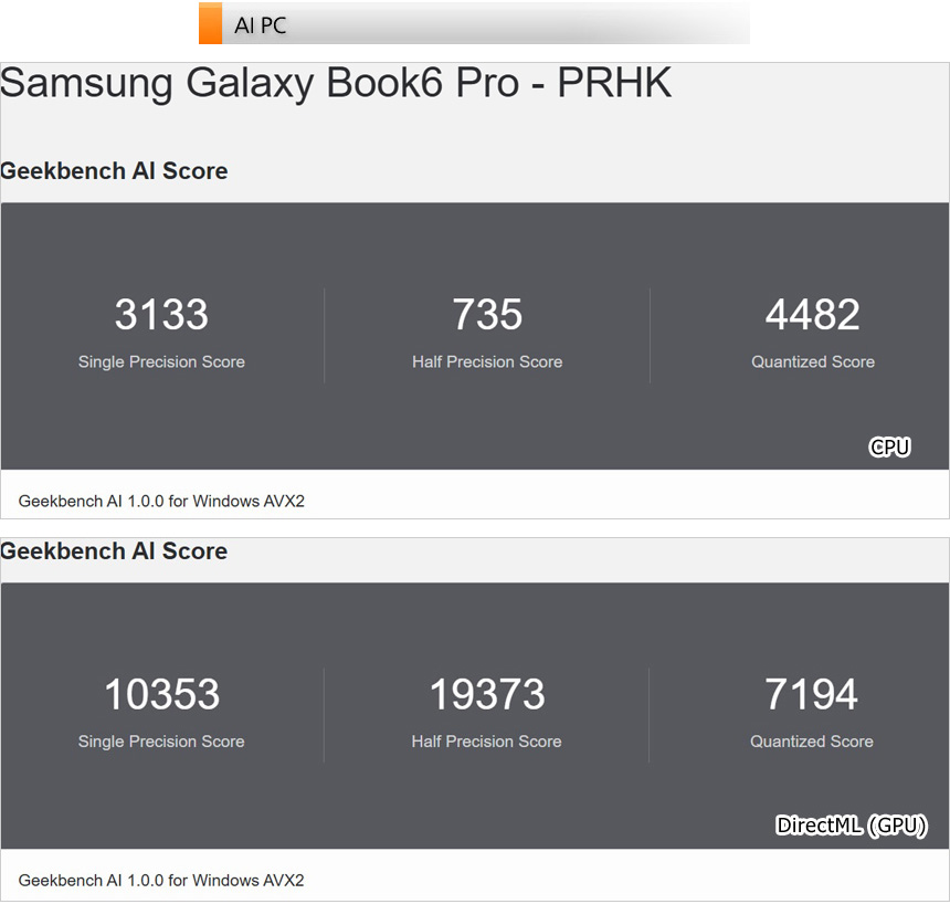 벤치마크 툴을 이용해 AI 성능 테스트를 진행하고 있는 모습으로 AI 에 특화된 CPU가 탑재된 모델답게 높은 스코어를 보여주었다. (전작대비 DirectML 의 스코어가 확연하게 높아진 것을 확인할 수 있었다.)