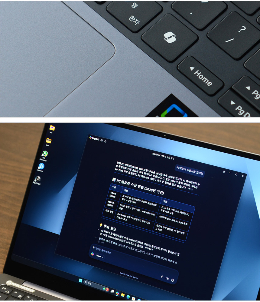 16GB 메모리를 지원해 대부분의 작업을 부드럽게 실행할 수 있으며 인텔 Wi-Fi 7 무선랜카드와 지문인식 센서, 고화질 웹캠이 설치된 것도 확인할 수 있다. 또한 윈도우 11 Home 이 기본 탑재되어 정품OS가 필수적인 환경에서도 제약없이 사용할 수 있고 인텔 아크 내장그래픽을 지원하는 것도 눈에 띈다. (인텔코어 울트라 5 에서는 338H 만 아크 내장그래픽을 지원한다.)