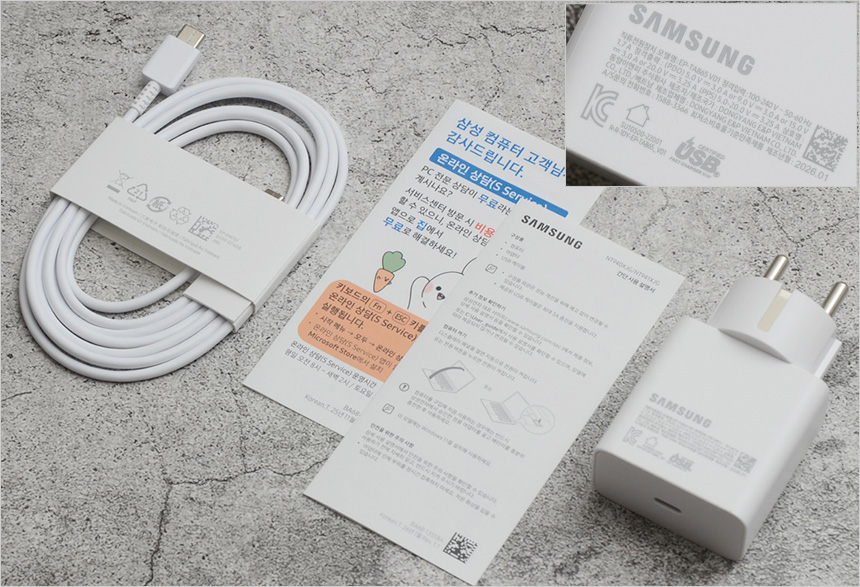 제공하는 액세서리의 모습으로 작은 크기로 휴대성을 높인 65W 전원 어댑터를 비롯해 USB 케이블과 퀵 매뉴얼이 제공되는 것을 확인할 수 있다.