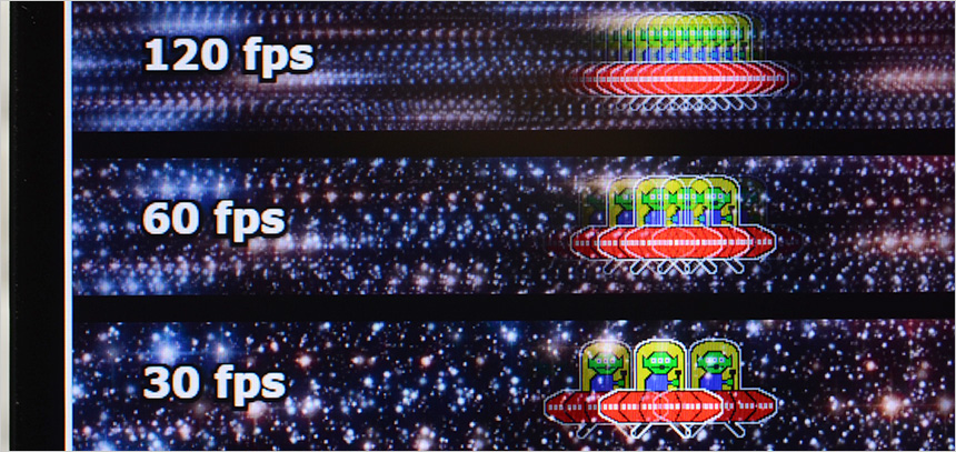 보급형 모니터와 달리 120Hz 주사율 지원으로 순간적인 움직임도 정확하게 파악하고 빠르게 대응할 수 있다. 상단의 사진은 240Hz 의 높은 주사율을 쉽게 확인할 수 있도록 하위 프레임과 같이 재생되는 영상 (960 Pixel Per Sec) 을 셔터스피드 1/20 로 촬영한 모습으로 프레임이 높아질수록 시간당 많은 화면이 뿌려지기 때문에 캐릭터의 수가 많은 것을 확인할 수 있다. 직접 눈으로 영상을 볼 경우 120Hz 가 훨씬 자연스럽게 움직인다.
