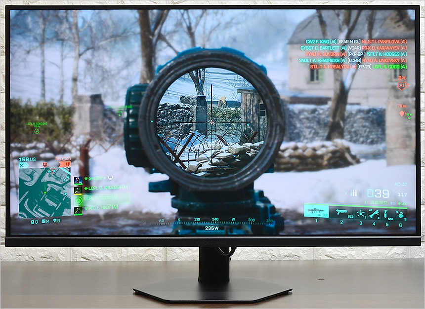 게이밍 모니터 전문기업인 크로스오버의 DNA가 이식된 모델답게 다양한 게이밍 성능이 출중한 것도 마음에 든다. 120Hz 주사율과 5ms 응답속도 지원으로 FPS 게임도 충분히 즐길 수 있었으며 프리싱크와 지싱크 어댑티브 지원으로 화면 찢어짐 등으로 인한 불편도 없었다. 또한 조준선 지원으로 편하게 에임을 잡을 수 있었으며 게임모드와 블랙래벨 지원으로 실내나 야간맵에서도 배경과 캐릭터를 확연하게 구분할 수 있었다.