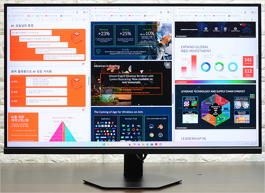 고화질 유튜브 동영상과 4K 동영상을 플레이 하고 있는 모습으로 IPS 특유의 깊이감 있는 컬러에 QHD 특유의 디테일이 더해져 만족스럽게 영상을 즐길 수 있다. 특히 27형 대화면에 슬림베젤 적용으로 탁 트인 시야감을 경험할 수 있으며 2개의 3W 스피커가 장착되어 시원시원한 사운드를 들려주었다.