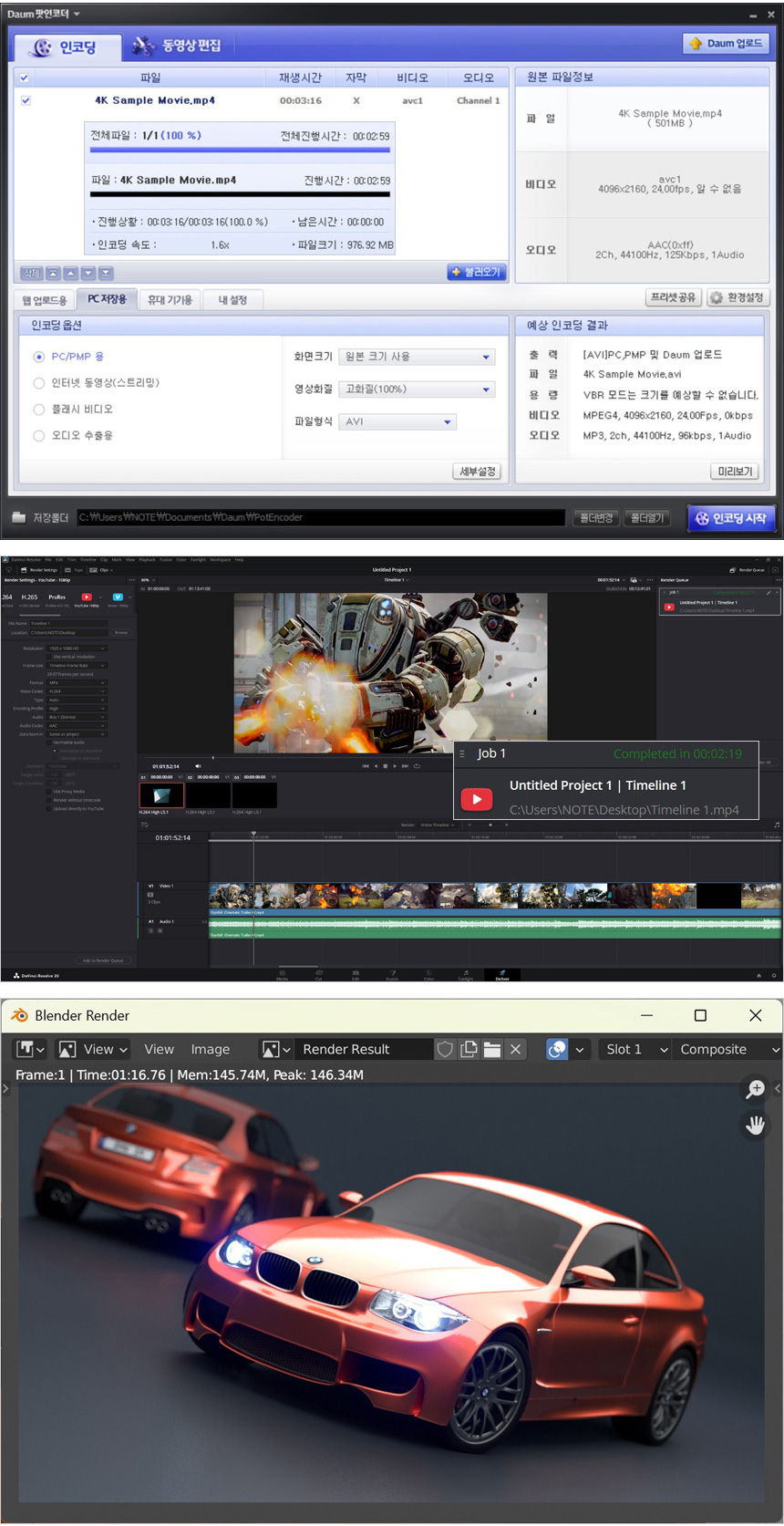 체감성능 확인을 위해 인코딩과 랜더링 테스트를 진행했는데 인코딩은 3분 5초에서 2분 59초로 시간이 단축되었으며 CPU 사용율이 극히 높은 블랜더 랜더링의 경우 1분 38초에서 1분 16초로 시간이 단축되었다. (다빈치리졸브 랜더링은 사용했던 S/W 버전이 달라 비교가 불가하다.)
