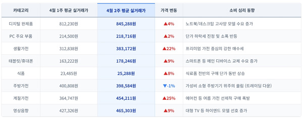 다나와가 분석한 4월 2주 차(4.6~4.12) 소비 시장은 주방가전을 제외한 7개 핵심 카테고리의 평균 실거래가가 일제히 상승하며, 프리미엄·고성능 제품에 대한 소비 지출이 늘어나는 ‘트레이딩 업(Trading Up)’ 양상이 뚜렷하게 나타났다.