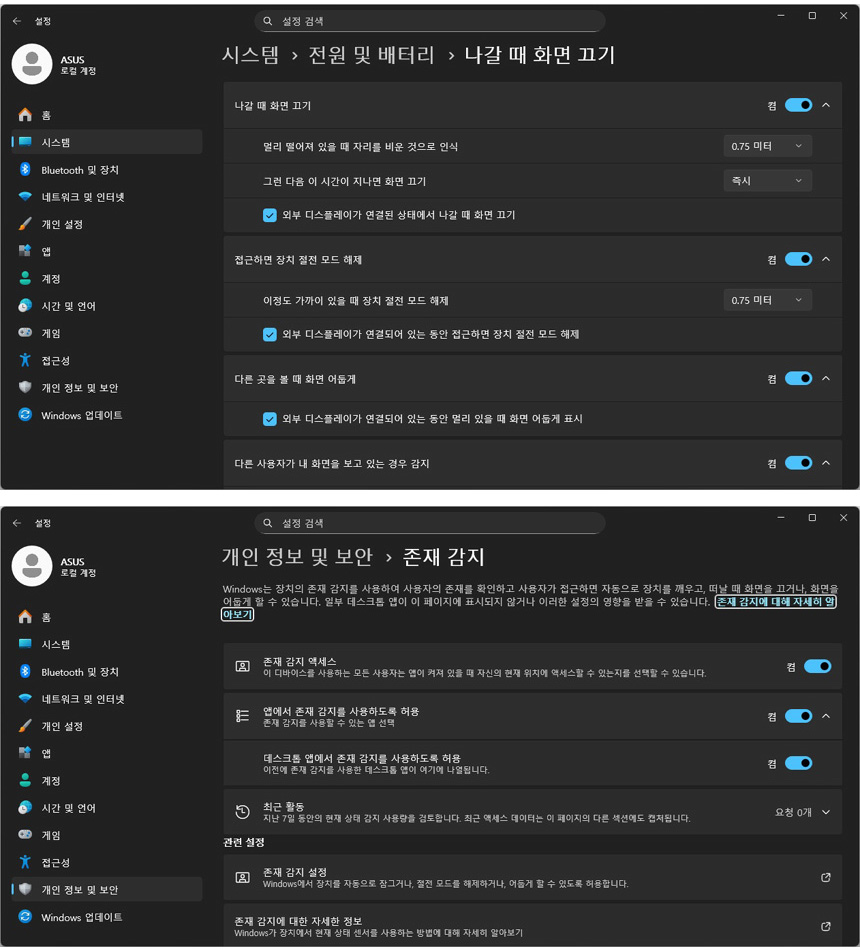 인체감지를 통해 더 강력한 보안 설정이 가능하다. 사용자가 다른곳을 볼때 자동으로 화면이 어두워 지며 자리를 비우면 화면이 자동으로 꺼지도록 설정할 수 있어 보안성과 편의성을 한층 높일 수 있다. @ 이 기능은 얼굴인식과 함께 사용하는 것을 적극 권장한다. 외부에서 자리를 비우면 자동으로 화면이 꺼지며 노트북이 잠금 상태가 되며 사용자가 자리에 앉으면 얼굴을 인식해 자동으로 켜지며 로그인 된다.