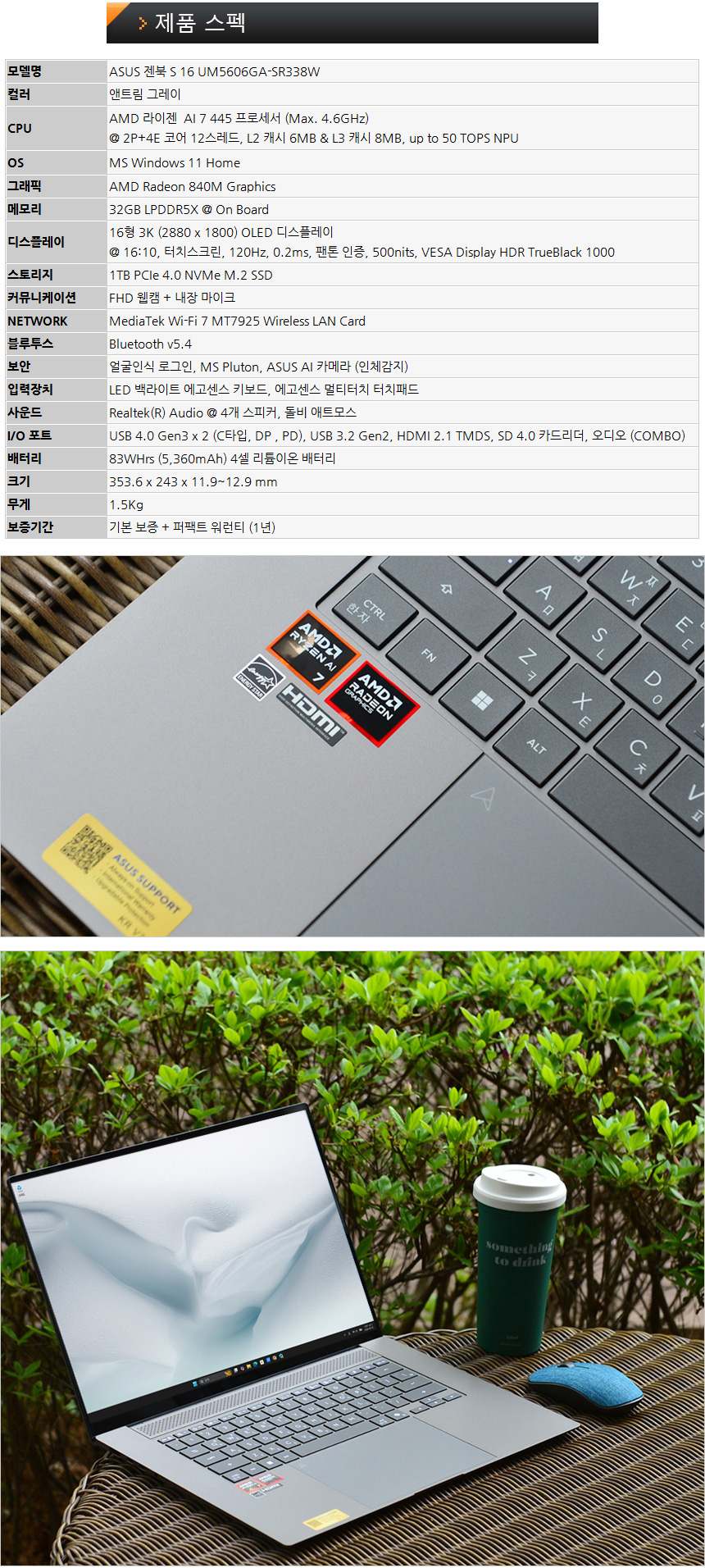 이번에 리뷰를 진행 할 ASUS 젠북 S 16 OLED UM5606GA-SR338W 는 다용도로 활용할 수 있는 내장그래픽 기반의 AI 노트북으로 AMD 라이젠 7 AI 445 프로세서를 탑재하고 32GB 대용량 메모리를 지원해 캐주얼한 용도는 물론 높은 성능을 필요로 하는 랜더링 이나 디자인, 영상편집 등의 용도로 활용할 수 있다. 특히 최대 50 TOPs 지원 NPU를 탑재해 코파일럿은 물론 다양한 AI 애플리케이션을 부드럽게 사용할 수 있다.