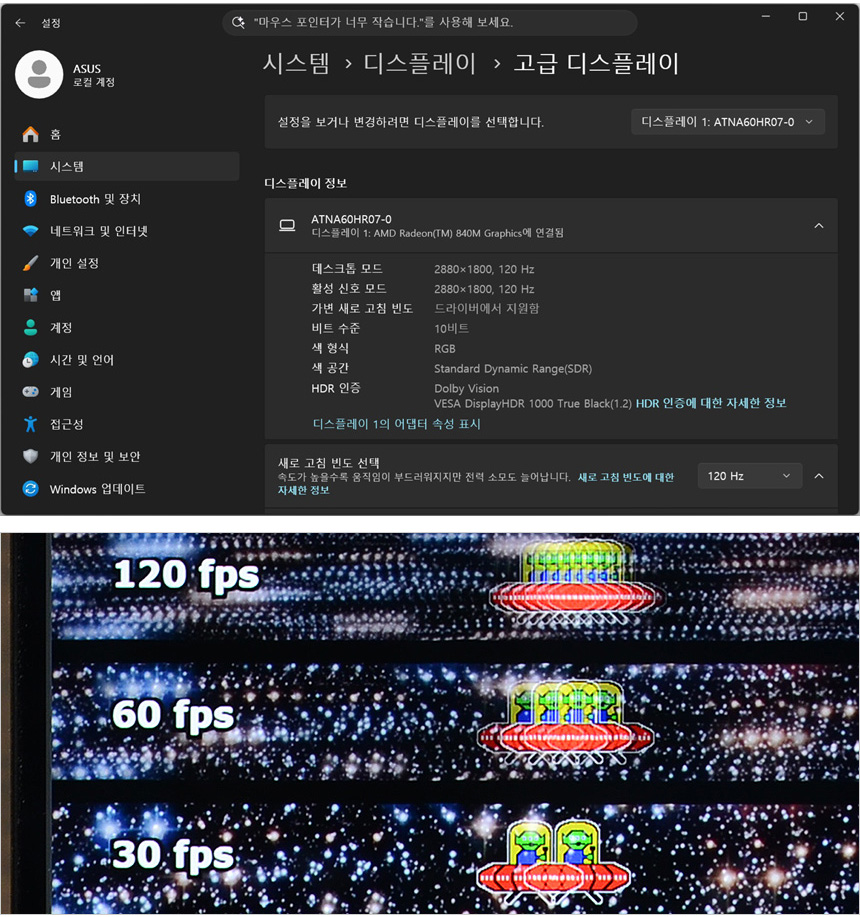 60Hz 주사율을 지원하는 일반 노트북과 달리 이 제품은 120Hz 의 높은 주사율을 지원한다. 여기에 0.2ms 응답속도까지 제공해 빠르게 움직이는 영상을 부드럽고 선명하게 표현해 준다. 모션등의 전문작업을 하는 유저들은 확연히 다른 움직임을 경험할 수 있을 것이다. 상단의 사진은 주사율에 따른 캐릭터 움직임을 카메라로 촬영한 모습으로 (셔터속도 1/20) 하위 프레임과 확연한 차이를 보여주고 있다. 최근 출시되는 스마트폰이 90Hz 나 120Hz를 지원하는 것은 특유의 부드러운 화면 전환 때문이다. 이 제품도 60Hz 노트북과는 확연히 다른 부드러움을 경험할 수 있다.
