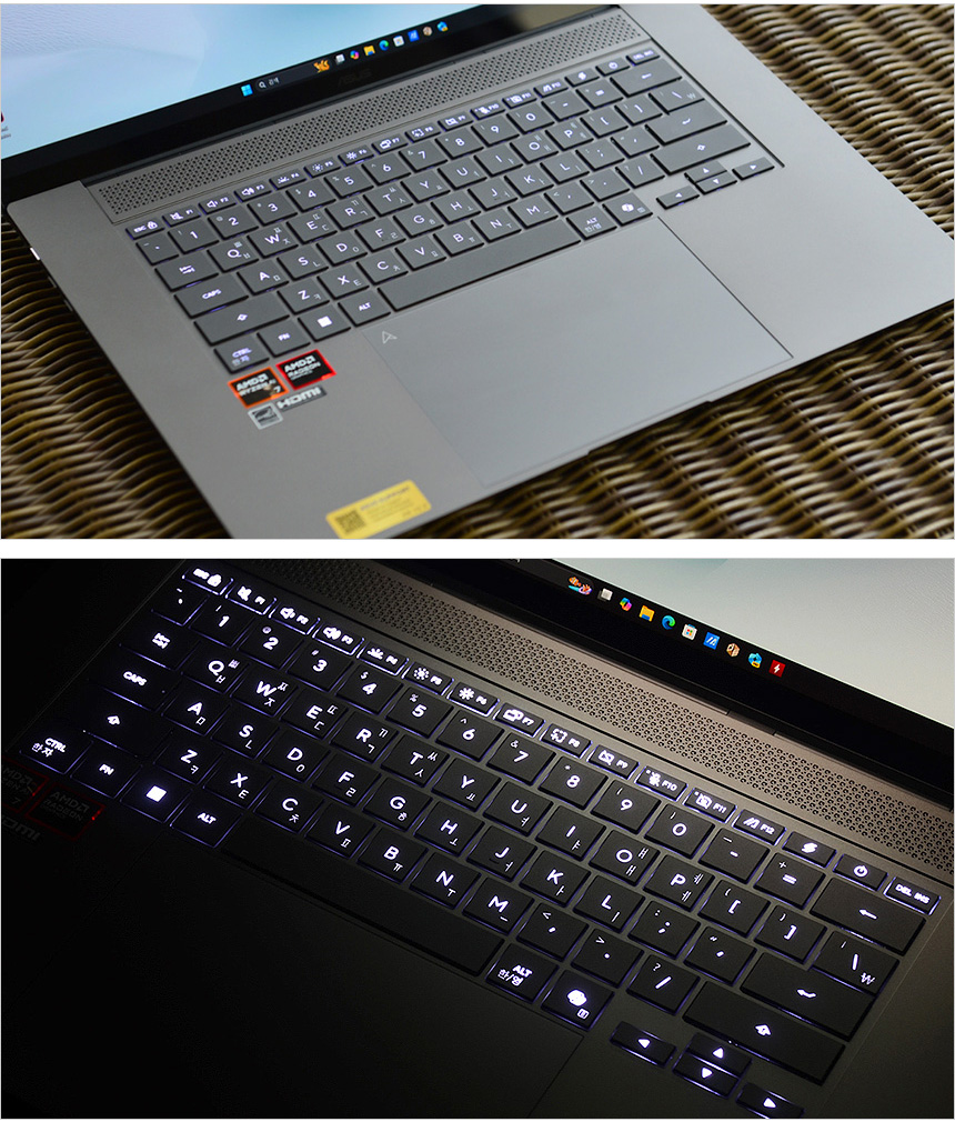 키보드의 모습으로 16형 대화면을 지원함에도 텐키리스 키보드가 장착된 것을 확인할 수 있다. NUM 키패드를 지원하지 않아 숫자 입력이 많은 엑셀등의 작업에서는 다소 불편이 따르지만 키보드가 한쪽으로 치우쳐 있지 않고 중앙에 위치해 타이핑은 훨씬 편한 장점을 가지고 있다. 또한 밝기 조정이 가능한 백라이트가 설치되어 야간에도 불편없이 노트북을 사용할 수 있다. @ 키캡에는 마모 방지를 위해 엑시머 코팅이 적용되어 오랜기간 걱정없이 사용할 수 있다. (번들거림이나 폰트의 지워짐 등을 걱정할 필요가 없다.)