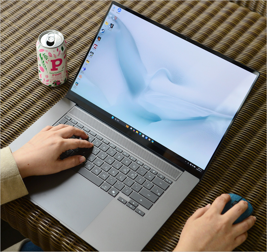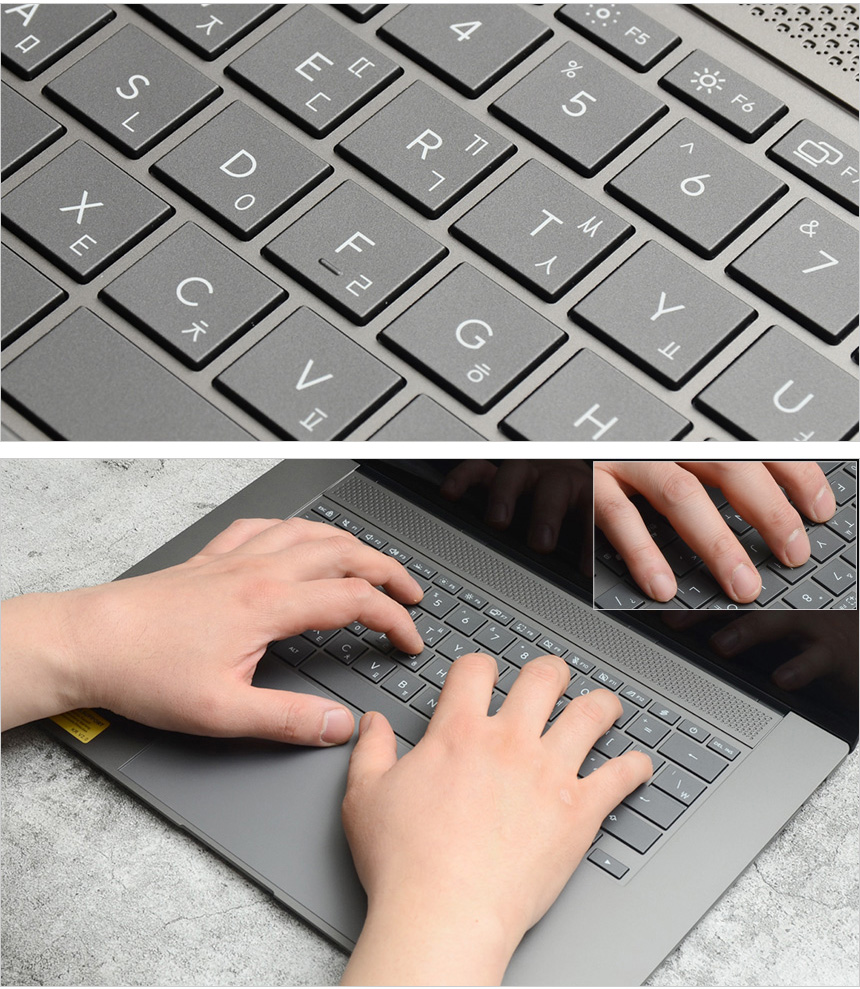 타이핑 테스트를 진행하고 있는 모습으로 16형 대화면 모델답게 팜래스트가 손을 완전히 받쳐주어 손목꺽임 등의 불편없이 노트북을 사용할 수 있었으며 여유로운 키간격으로 오타없는 고속 타이핑이 가능했다. 또한 확연한 구분감과 쫀득쫀득한 키감 제공으로 즐겁게 타이핑 할 수 있었다.
