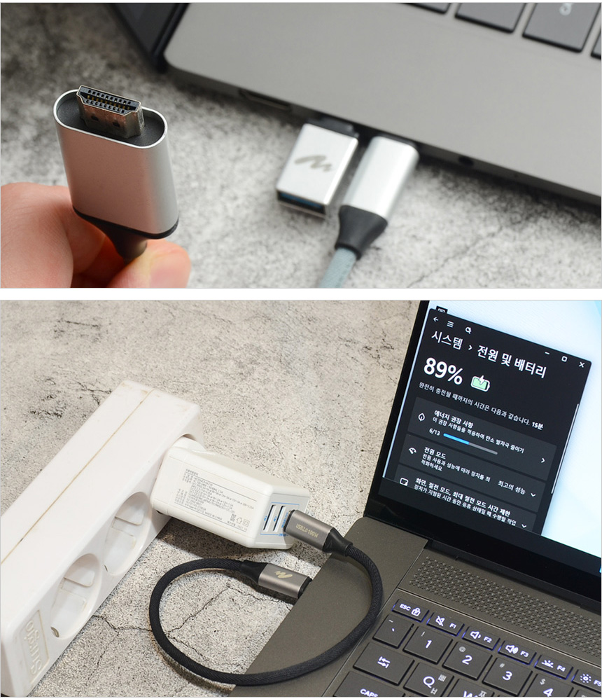 C타입의 USB 4.0 단자는 디스플레이 출력 기능을 지원해 어댑터나 케이블을 사용해 고해상도 모니터를 연결할 수 있다. 또한 젠더를 구입해 장착하면 A타입의 주변기기도 연결할 수 있으며 시중에서 쉽게 구입할 수 있는 PD충전기를 이용해 전원을 공급할 수 있다.
