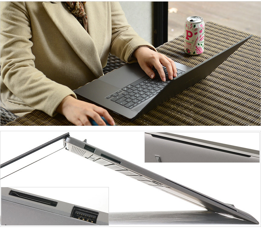 디자인은 상단에서 언급한 것과 같이 상당히 세련된 것을 확인할 수 있다. 중후하고 고급스러운 느낌을 주는 앤드림 그레이 컬러를 적용했으며 알루미늄과 세라믹을 결합한 세랄루미늄이 적용되어 가벼울 뿐만 아니라 대단히 견고하다. 지문이나 먼지가 잘 묻어나지 않으며 색 바램과 마모 등에도 강해 깔끔한 상태로 노트북을 유지할 수 있다. (마감의 완성도가 상당히 뛰어난 노트북이다.)