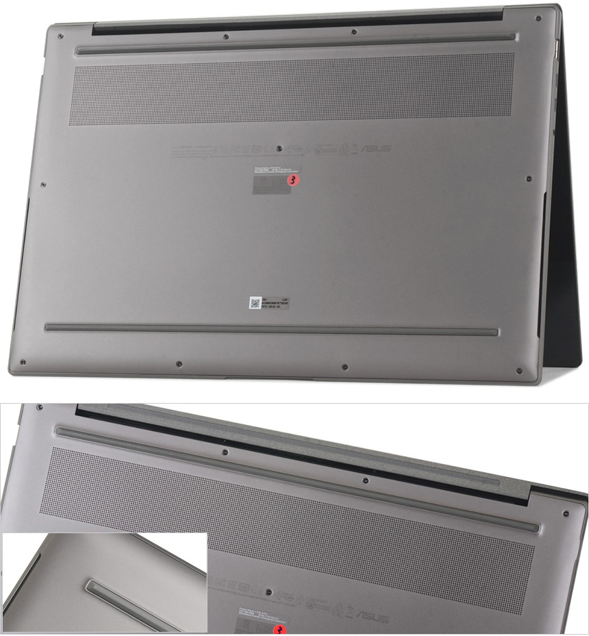 바닥면의 모습으로 CPU와 전원부 등이 설치된 상단에 통풍구가 설치되어 있고 상단과 하단에 고무패드가 부착되어 미끄러짐을 방지한다. @ 전원설정을 균형조정 (밝기 50%, 에어플레인 모드, 60Hz, 저소음모드) 으로 설정해 슬라이드 쇼를 무한 반복해 본 결과 24시간 49분 재생 후 대기모드로 진입했으며 노트북이 꺼진 상태에서 1시간 동안 충전했을 때 73% 배터리 충전이 이루어진 것을 확인할 수 있었다.