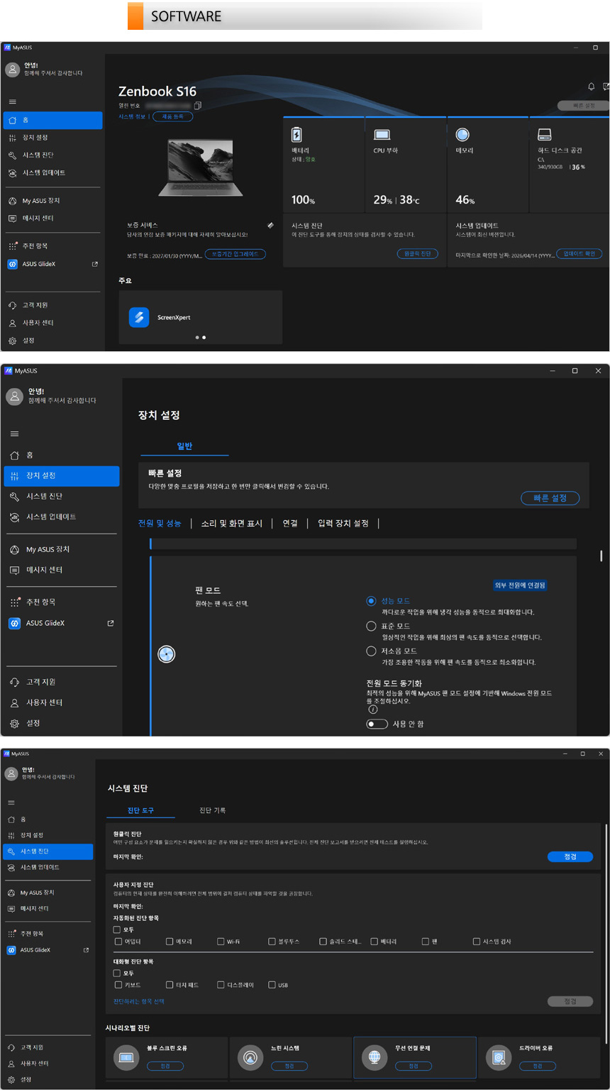 MyASUS 앱을 실행한 모습으로 (키보드에서 핫키를 지원해 빠른 실행이 가능하다.) 업데이트를 지원해 최상의 컨디션을 유지할 수 있으며 원클릭 진단 기능을 지원해 시스템의 문제를 빠르게 파악할 수 있다. @ 장치 설정의 자세한 사항은 동영상을 통해 확인하기 바란다.