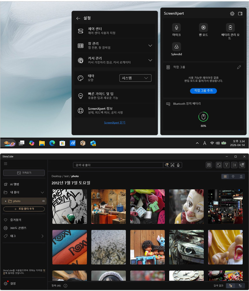 노트북을 더 편하게 사용할 수 있도록 스크린엑스퍼트를 지원하며 꾸준히 쌓이는 사진과 비디오 영상을 더 스마트하고 빠르게 관리할 수 있는 프로그램으로 연결된 장치나 클라우드에 데이터를 손쉽게 가져오거나 내보낼 수 있으며 이름이나 태그, 장치, 위치, 타임라인 등을 통해 손쉽게 원하는 파일을 검색할 수 있는 AI S/W ASUS StoryCube를 지원한다.