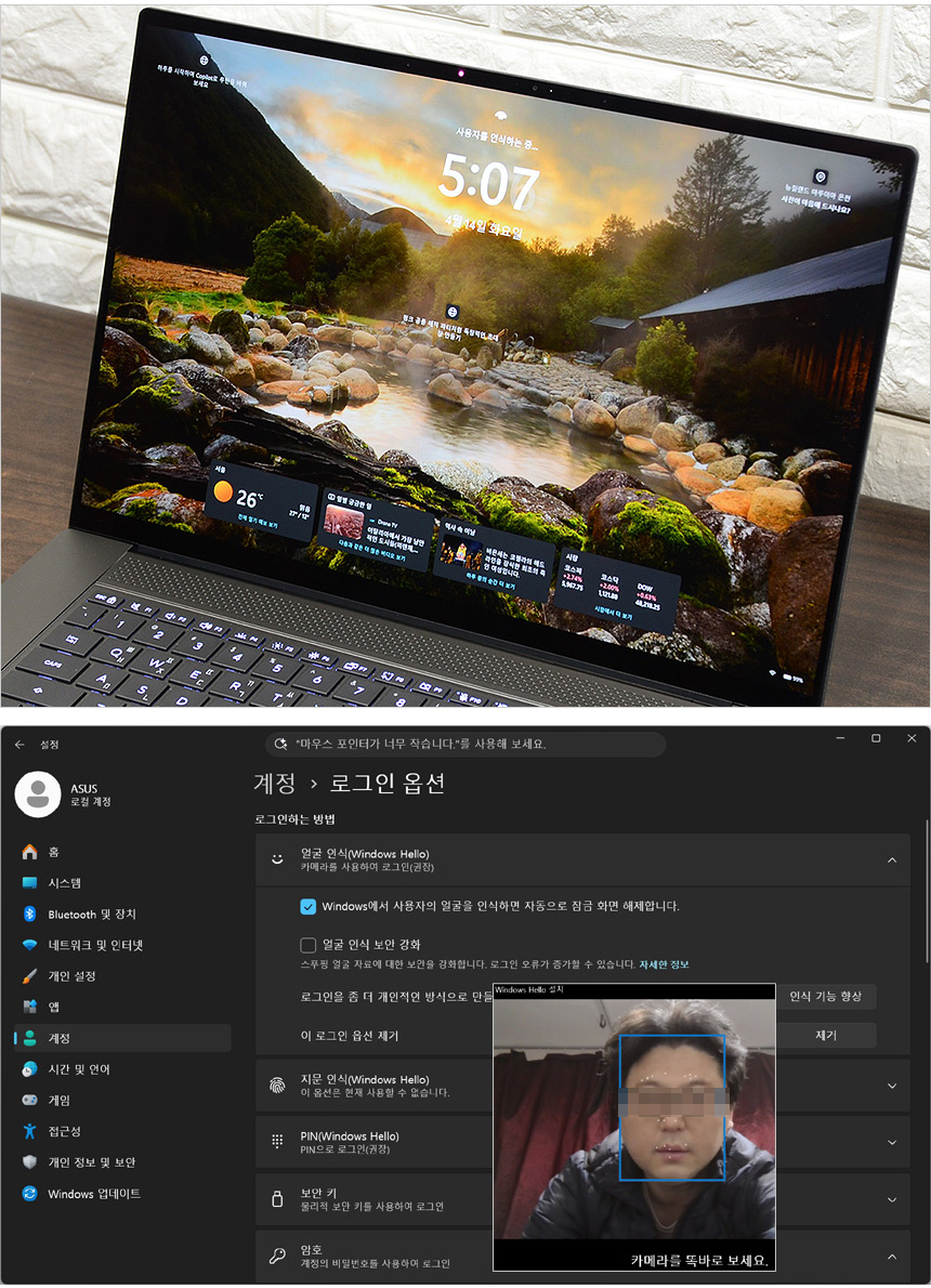 IR카메라가 탑재된 노트북으로 얼굴인식 로그인을 적용해 보안성을 높일 수 있다. 설정-계정에 있는 로그온 옵션에서 윈도우즈 헬로를 실행해 얼굴을 등록할 수 있으며 인식율도 뛰어나 편하게 사용할 수 있었다.