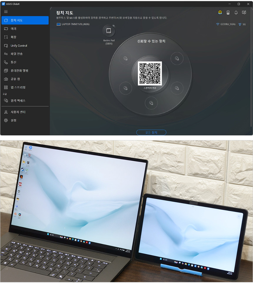 화면의 복제나 확장, 유니파이 컨트롤이 가능한 GlideX 앱을 지원한다. 상단의 사진은 확장 기능을 실행한 모습으로 태블릿 PC를 확장 모니터로 사용할 수 있었다. (참고로 미러를 선택하면 스마트폰 화면이 노트북에 표시된다.)