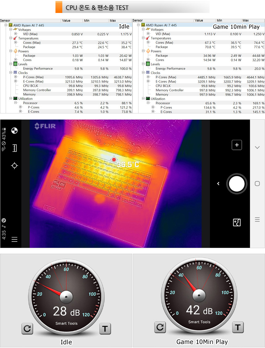 CPU 온도 테스트를 진행하고 있는 모습으로 (최고 성능 모드, 실내온도 15도) 아무것도 하지 않은 Idle 상태에서는 20도 후반으로 동작했으며 10분간 게임을 플레이 하고 측정했을 때 에 70도 초반까지 온도가 올라갔다. (일반 노트북 대비 온도가 상당히 낮다.) 또한 열화상 카메라를 이용해 게임 실행시 열분포를 확인했는데 상단 중앙부를 중심으로 열이 퍼져 나가며 팬이 설치된 양 측면은 상대적으로 온도가 낮았다. 팜래스트 온도는 상대적으로 낮아 열로인한 스트레스 없이 손을 올려두고 타이핑 할 수 있다.