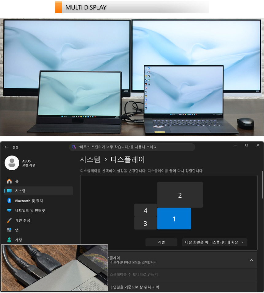 2개의 USB 4 단자가 디스플레이 출력을 지원해 HDMI를 포함한 3개의 모니터를 추가할 수 있다. 상단의 사진은 멀티 디스플레이 테스트를 진행하고 있는 모습으로 원할하게 작동하는 것을 확인할 수 있었다. 다중 모니터 사용이 필수적인 직장인 이나 대학생들이 특히 유용하게 활용할 수 있을 것이다.