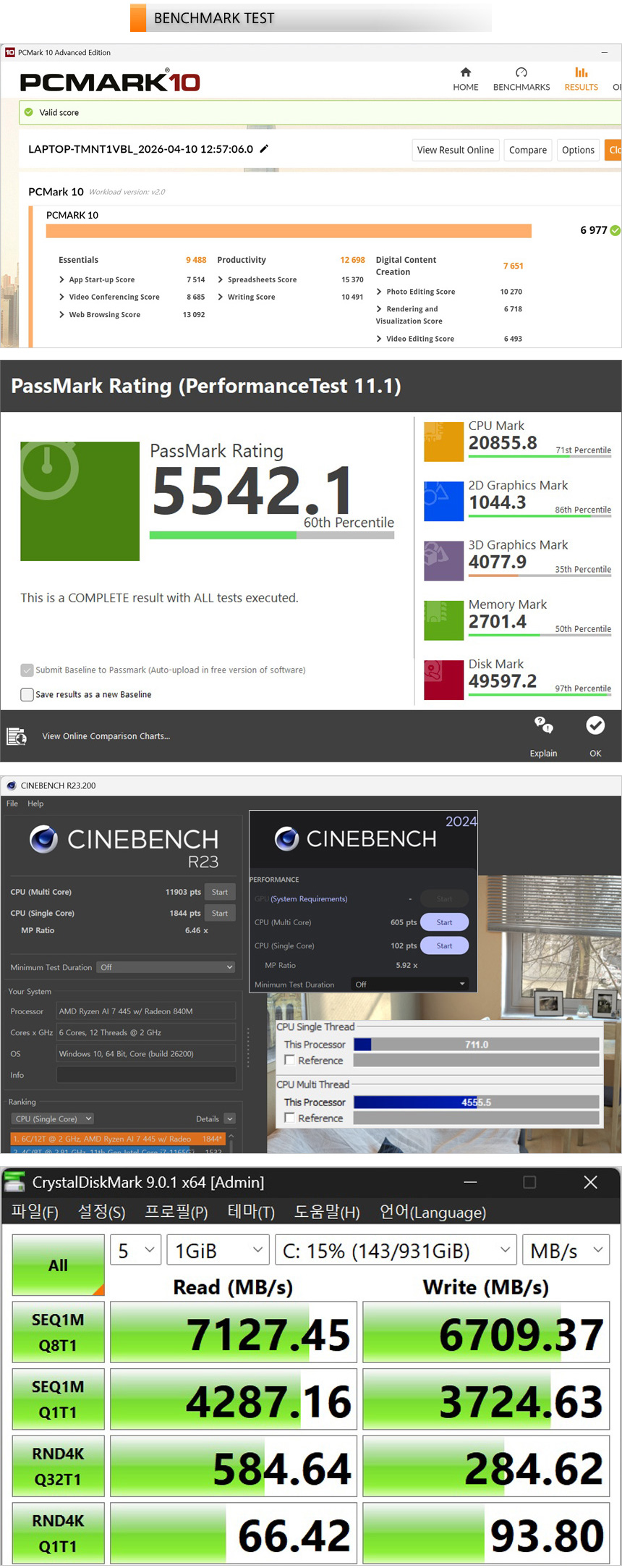 벤치마크 테스트를 진행하고 있는 모습으로 하이엔드급 모델들과는 다소 차이가 있지만 다용도로 충분히 활용할 수 있는 스코어를 보여주었다. 문서작업이나 고화질 동영상 감상은 물론 디자인 등의 작업도 부드럽게 실행할 수 있다. 또한 SSD 속도를 확인해 보았는데 PCIe 4.0 지원 모델답게 엄청나게 빠른 속도를 보여주었다. (1TB 대용량 지원으로 여유롭게 데이터를 저장할 수 있다.)