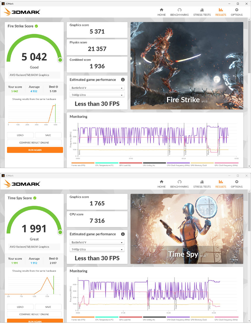 3DMARK를 실행한 모습으로 캐주얼한 게임은 원활하게 플레이 할 수 있는 스코어를 보여주었다. (참고로 해상도를 낮추고 업스케일링 기술을 사용하면 최신 게임도 플레이 할 수 있다.)