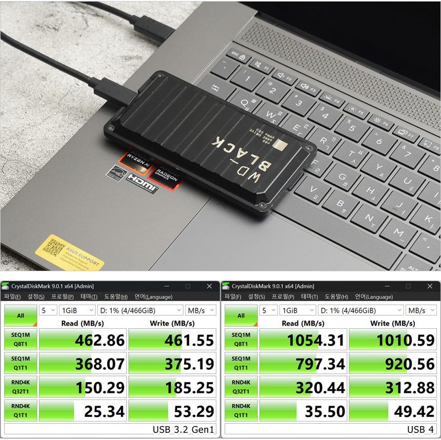 USB 4 단자를 지원해 빠른 데이터 전송이 가능하다. 상단의 사진은 외장 SSD를 이용해 테스트를 진행하고 있는 모습으로 USB 3.2 Gen1 과 확연한 차이를 보여주는 것을 확인할 수 있다.