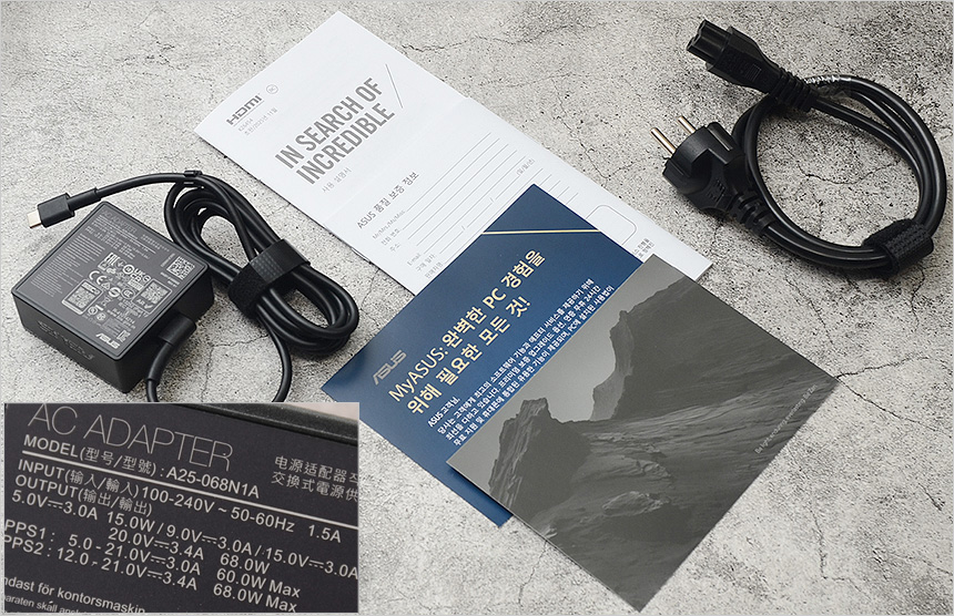구성품의 모습으로 노트북을 비롯해 68W 전원 어댑터와 전원 케이블이 제공되며 보증서, 퀵 매뉴얼 등이 포함되어 있다.