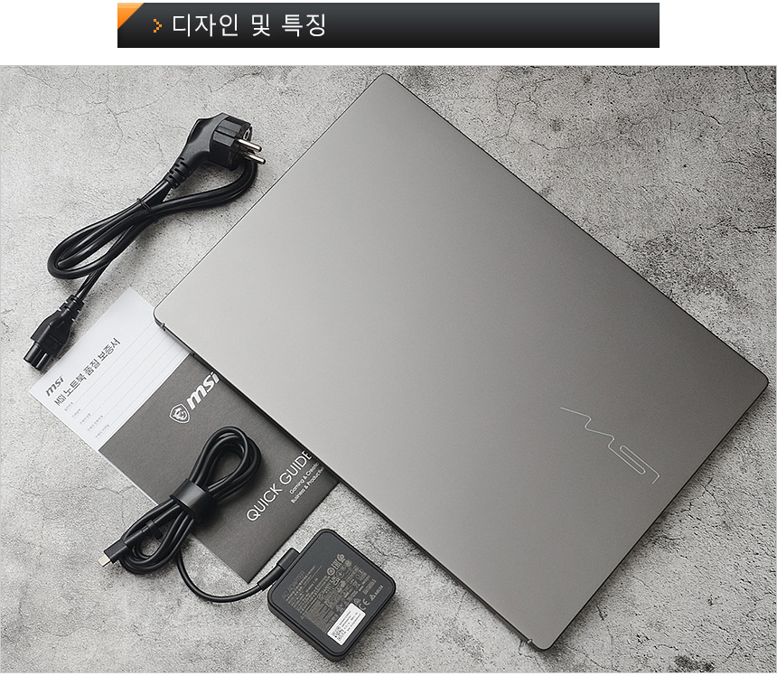 구성품의 모습으로 노트북을 비롯해 C타입의 65W 전원 어댑터와 전원 케이블을 비롯해 퀵 매뉴얼과 보증서가 포함된 것을 확인할 수 있다.