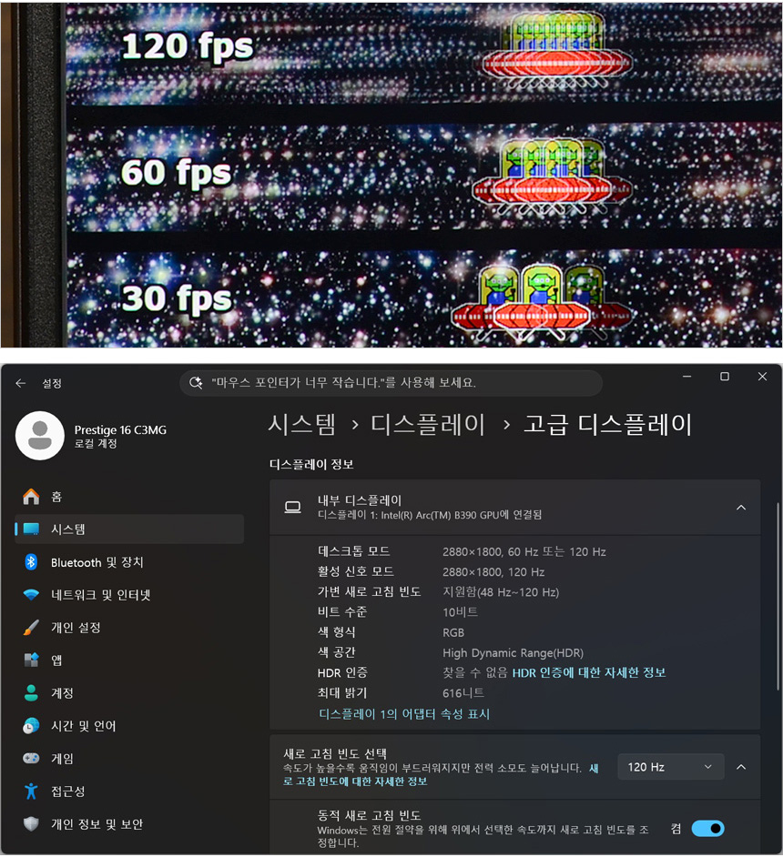 120Hz 주사율을 지원하며 영상에 맞게 주사율을 조정하는 가변주사율을 적용해 불필요한 배터리 소모를 최소화 할 수 있다. (48~120Hz VRR 지원) 상단의 사진은 하위 프레임과 같이 재생되는 영상 (960 Pixel Per Sec) 을 셔터스피드 1/20 로 촬영한 모습으로 프레임이 낮을수록 캐릭터의 수가 적으며 프레임이 높아질수록 시간당 많은 화면이 뿌려지기 때문에 캐릭터의 수가 많은 것을 확인할 수 있다.