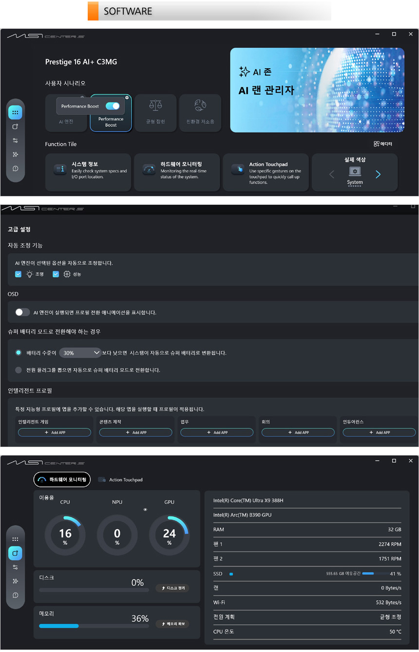 전용 S/W인 MSI 센터S 의 모습으로 메인화면에서 퍼포먼스와 디스플레이 컬러 설정이 가능하며 AI 엔진 세부설정에서 지원 기능과 배터리 상태 등을 선택할 수 있다. 또한 시스템 모니터링이 가능하며 상단에 확인한 액션 터치패드 설정도 지원한다.